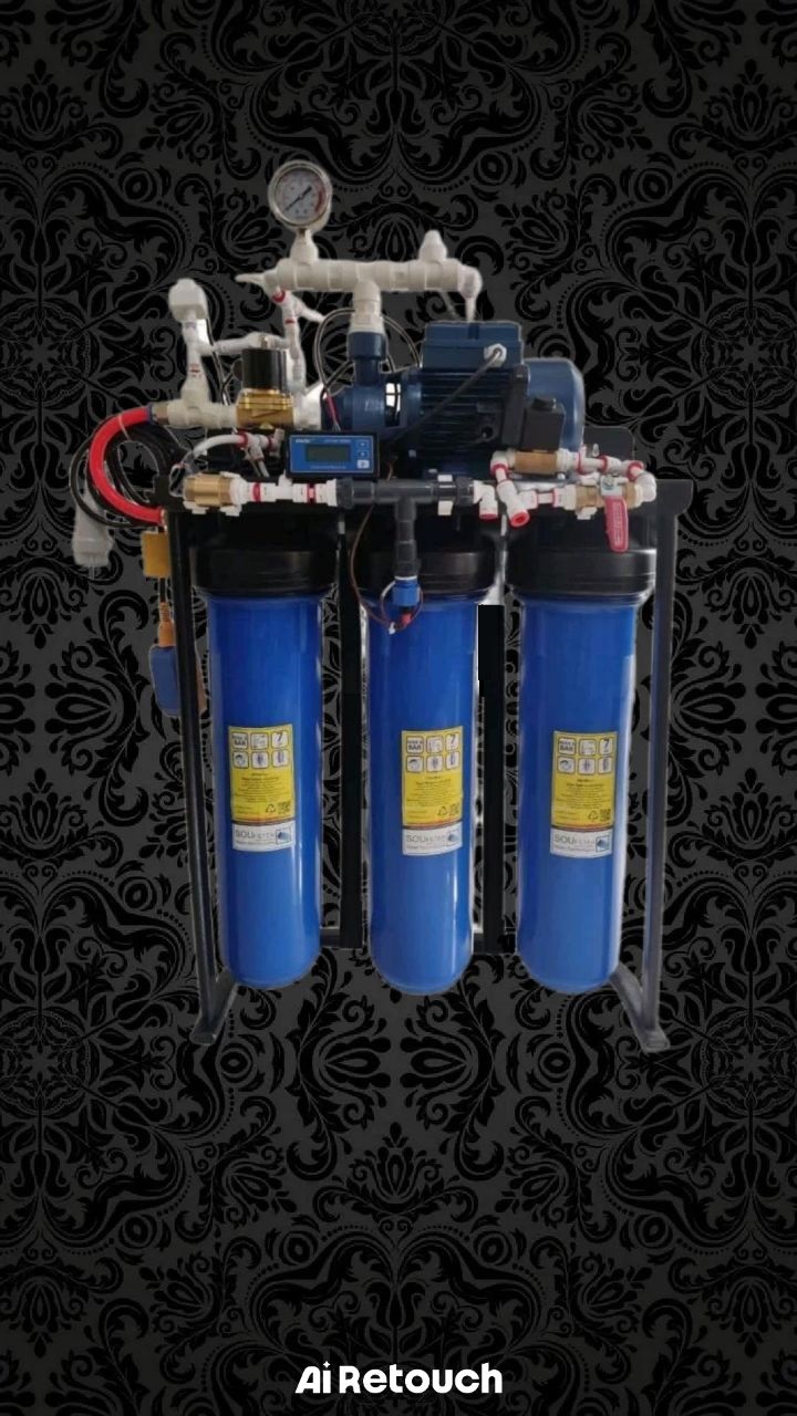 - فیلتر های پیش تصفیه: دارای ۳ مرحله پیش تصفیه های الیافی و کربنی در سایز ۲۰ اینچ جامبو به دلیل بالا بودن ظرفیت تولید در محل هایی که آب با کدورت و سختی بسیار بالا وارد دستگاه می شود.از پیش تصفیه های مناسب به آب منطقه در قبل از دستگاه استفاده نمایید که از آسیب به ممبران پمپ جلوگیری شود.